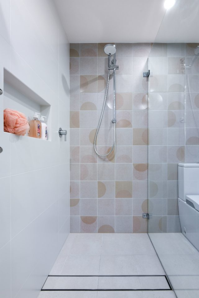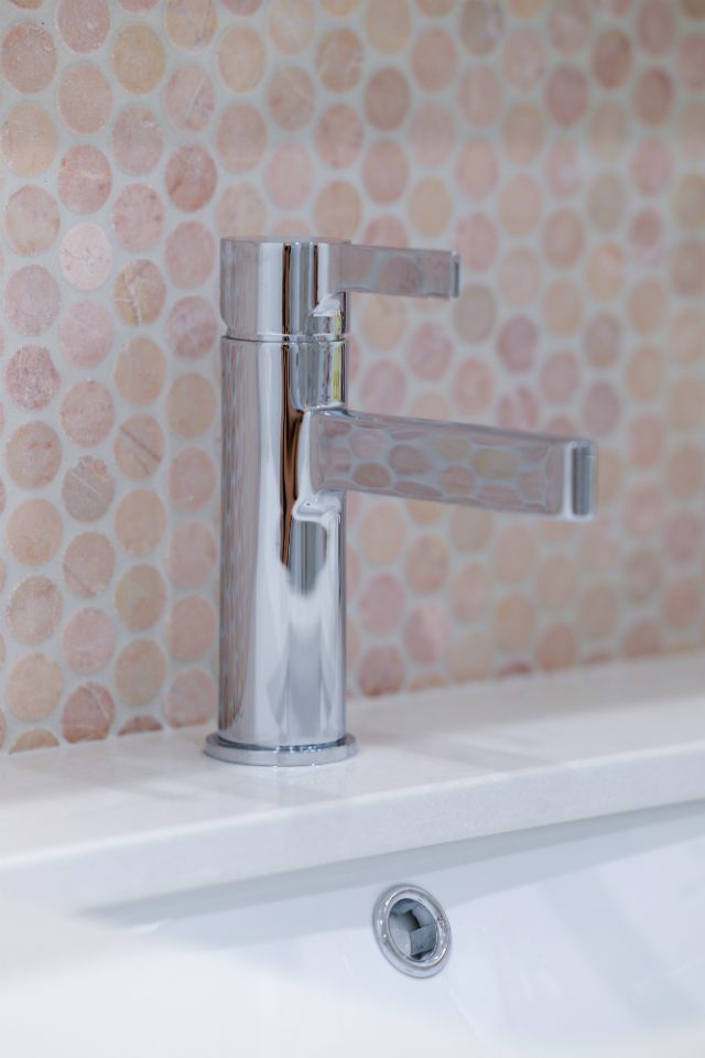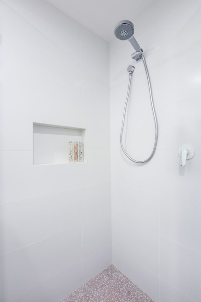 The rose coloured terrazzo look porcelain floor tile is a standout feature in the second bathroom. The exclusive terrazzo look porcelain tiles offer an on-trend look of terrazzo tiles without concerns for sealing and maintenance. Pink Luxecrete benchtop is the latest innovation in concrete providing a beautiful addition to the bathroom. The white and chrome wall basin mixer tap set brings the sense of calm to the bathroom space with its clean, simple lines.