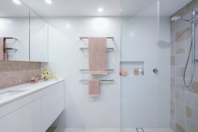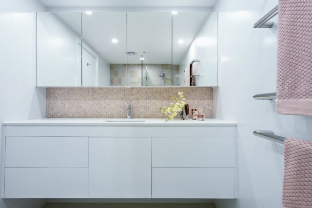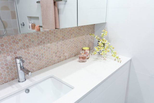 Luxurious Ice Pink tumbled marble mosaic tile is used on the splashback in one of the bathrooms. Its soft pastel pink tone works perfectly with the blush tones in the feature tile on the opposite wall. The overlapping patterns and finishes on the feature tile add playful touch to the design scheme. The Overlap tiles reflect in the mirrored shaving cabinet that provides plenty of storage. The pink tiles are offset with simple matt white rectified wall tiles. The undermount basin is used together with a Caesarstone benchtop; it gives beautiful clean look to the vanity and creates a lux feel in the bathroom.