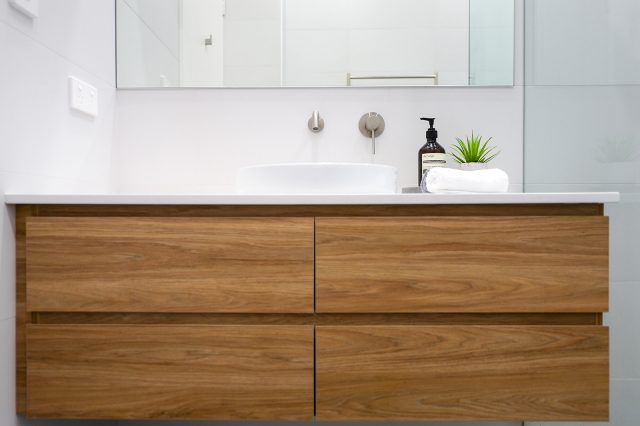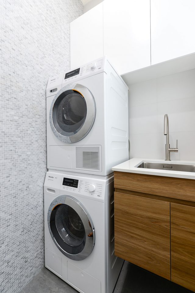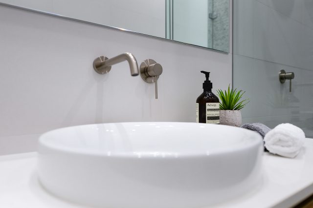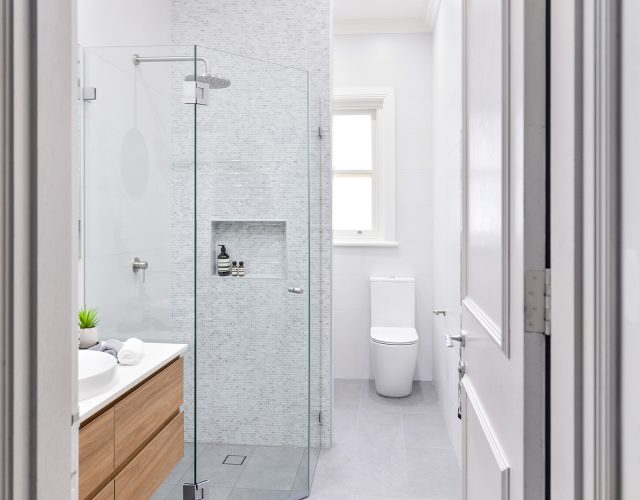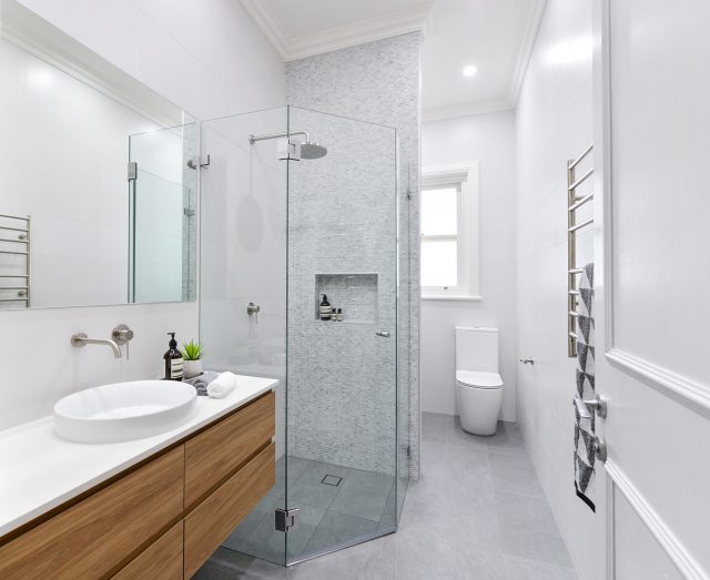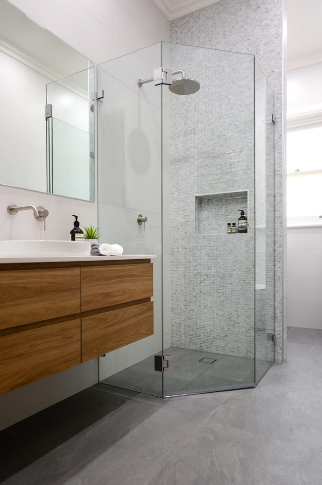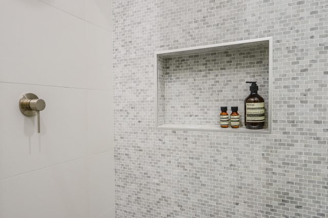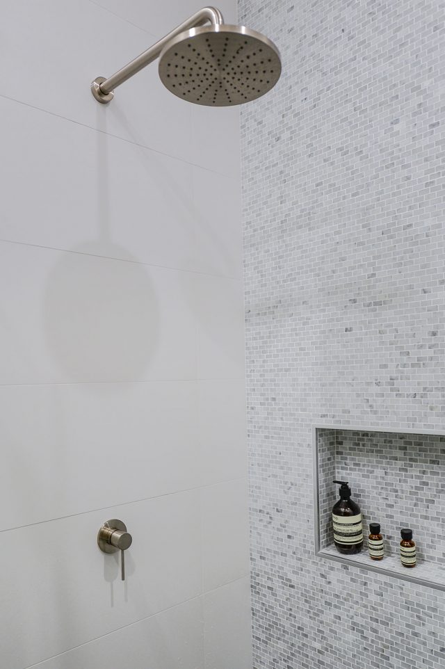 Our clients were inspired by the lux feel of the bathrooms in high end hotels. They wanted to recreate the look in their own home. We used high quality stylish fittings, fine finishes and timeless accessories to create hotel inspired bathrooms that our clients could enjoy without travelling far. The family bathroom is beautiful but functional at the same time. Clever design hides the laundry behind the shower wall tiled in natural marble mosaic. A subtle mini brick mosaic brings character into the bathroom while working beautifully with mid grey floor tiles and white matt wall tiles. Wall recessed mirrored shaving cabinet creates clean streamlined look without compromising on storage, and semi insert basin gives the bathroom an elegant design look while being practical to use for 2 young kids.