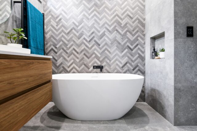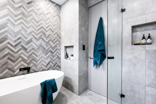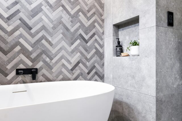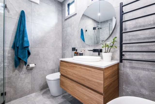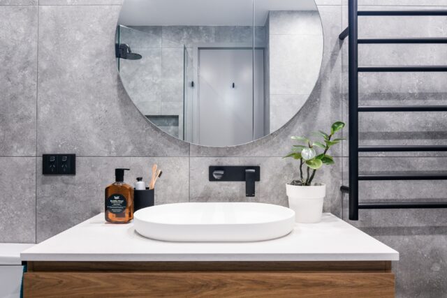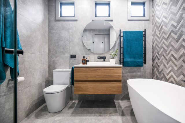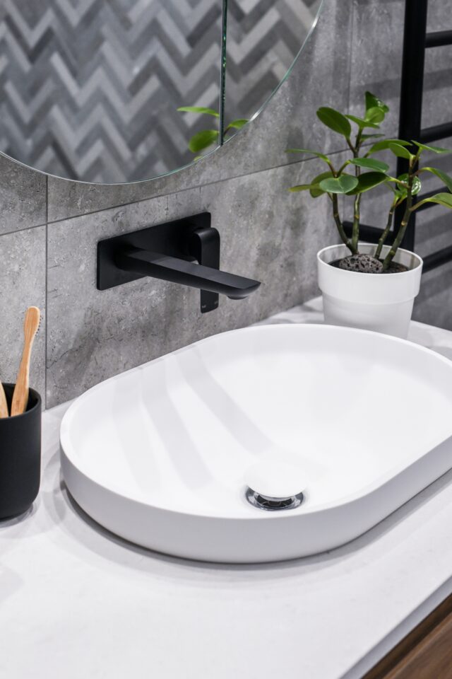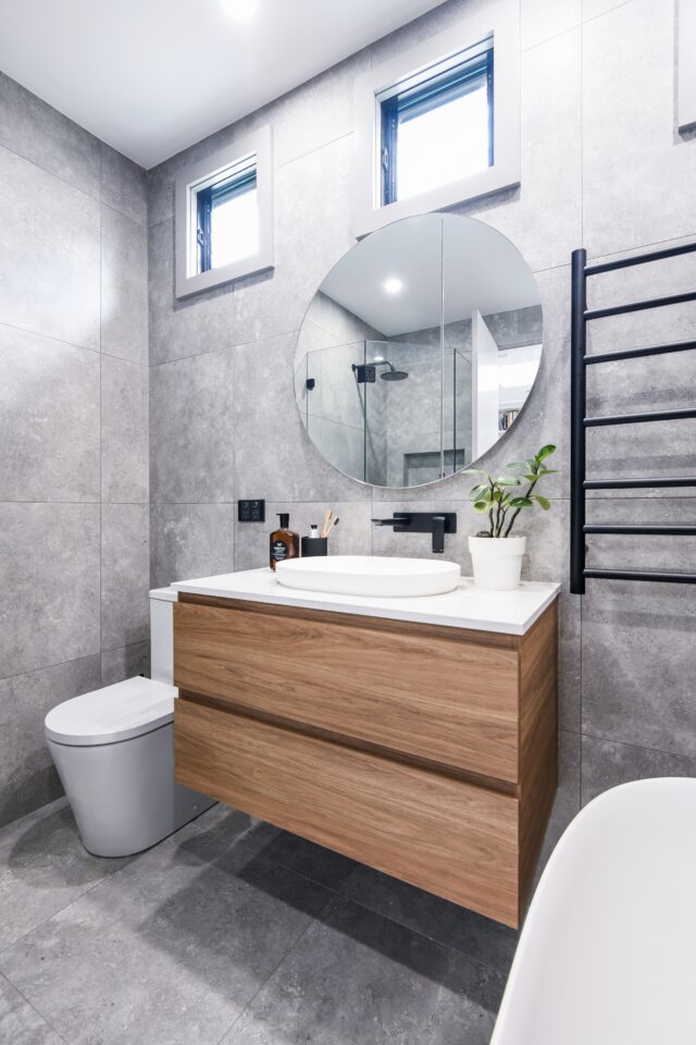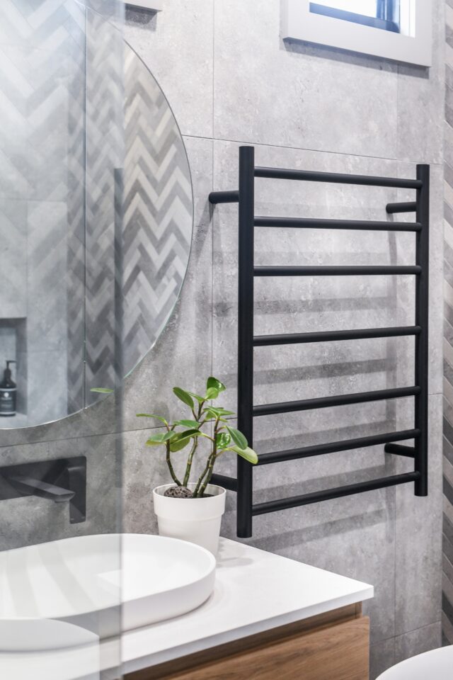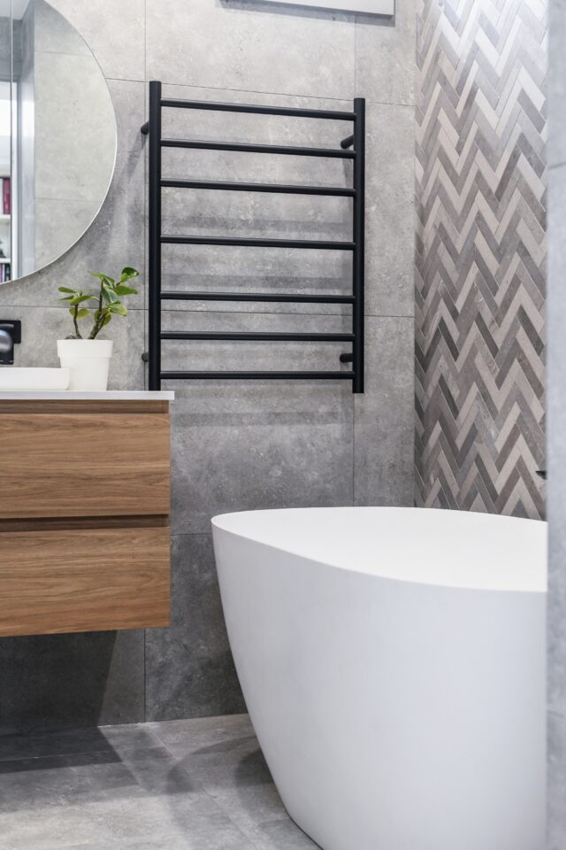 We have continued with the dark grey scheme for the new ensuite by selecting matte black finish for the tapware and all the accessories, and picking an elegant grey tile for the walls and the floor. The grey feature tile in herringbone pattern gives the bathroom distinction and creates a focal point by drawing attention to the stunning freestanding bath. Made from cast solid surface and featuring a stunning 5mm edge and built in over-flow, the Kado Lussi Thin Edge bath is the perfect addition for a lasting luxury space. The Venice solid surface semi-inset basin is classical and timeless and blends seamlessly with the vanity. The timber look finish on the wall hung vanity adds texture and warmth to the design scheme. Bold and chic, Milli Glance wall tap combines sleek design and crisp lines. Contemporary round mirrored cabinet features simple yet clever design with hidden storage behind an elegant mirror.