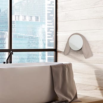 An enameled and warm circle, to be installed on the wall, to keep your towels dry every day. The material is the same ceramic of the sintered tile, with a round and colored shape to be placed side by side with the washbasin or the shower to embellish your most intimate environment.